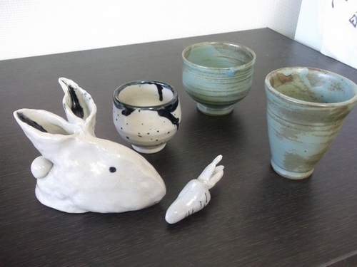 というわけで画伯!この作品のポイントは? 造形は問題ないが若干の絵付けに気の迷いがあるところ(笑) ・・そこが味・・なんですね? そう! という花入れは実は水がうまく入らない(笑) 正確には上から2番目のくびれのことろで内側がほぼ穴が極狭に なっているので水を入れるとこぽこぽこぽこぽ・・と気泡を 発しながら徐々に水が入るという難点が・・(笑) 当然水をこぼす時も大変なんだけどね(笑) 画伯!これはわざとですか? これは実用性ではないのだよ!芸術性重視なのだよ! ・・・はいはい(笑)味のあるいい作品でございます(笑) さて同じくShinlyの「花入れ」 これは・・うさぎ・・ですか? もちろんでございます♪ ちょっと見てもいいですか~?あれ?・・うさぎ・・ ですよね?? あ!反対にしてはいけません!これは顔を右にした状態が 「作品」です!!! あ~・・なるほど・・左側を向けると・・「まんぼう」ですもんね(笑) ・・げ・・げいじゅつですから・・。 ![]() そして初めてのろくろ作品お題は「お茶碗」&「深いもの」