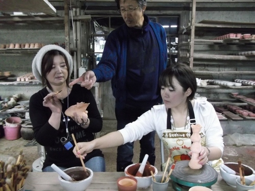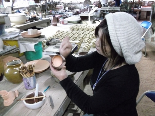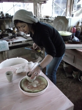 師匠曰く・・これは何色になるのかかなりわからない・・と。 Shinlyの出したかったのは「薄い藍色」くすんだ「青」というより「蒼」 というイメージの色だったんですがその「蒼」が出るかどうかは 一か八か的な釉薬なんだそうです・・ そして最後は「湯のみ」なんですが・・ これは「飛沫」(しぶき)を活かして筆先に付けた「青」の色を ぴっぴっぴっと飛ばして模様付して飲み口の部分から同じ色の 絵の具がたら~っと流れてくるような・・そんなイメージで。 そしてこれは絵を描いたのもと同じなのでガラス質の透明の 釉薬をかけます♪ さてShinlyの作品はどんな一か八かな色合いに焼きあがるんでしょう♪ これもまたすべては火の神様次第(笑) まぁ何はともあれ・・やっぱり願いはひとつ! 割れないで焼きあがってね・・(^_^;) 2人の色付けした作品はこんな感じ。。見た目は釉薬が覆っているので 単なる石膏か紙粘土作品(笑) さぁ~藤田師匠!!魔法をかけてくださいな♪ ![]() というわけで次回はいよいよ作品が登場します♪