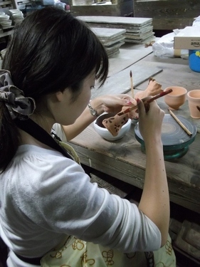 青など様々な色を選んだり組み合わせたり。。 絵を描いたものにはガラス質の透明の釉薬を かけることで一旦真っ白にまりますが 焼きあがると絵がコーティングされます♪ 佳代ちゃんは金結晶や色合いを1色にしないような 凝った選色をしたようです! 丁寧に丁寧に慎重に慎重に・・ さて佳代ちゃんの作品はどんな色合いを 浮かび上がらせてくれるんでしょうね♪ 金結晶も微妙な色合いもすべては火の神様次第(笑) まぁ何はともあれ・・ 割れないで焼きあがってね・・(^_^;) お次はShinlyの番だぞい! ・・・つづく。 |