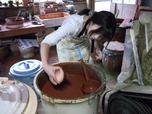 色を塗っていきます。 そして絵付けの終わった作品は 釉薬(ゆうやく)つまりうわぐすりに浸します。 ![]() これもまた金結晶の出る黒や茶色や赤の他に