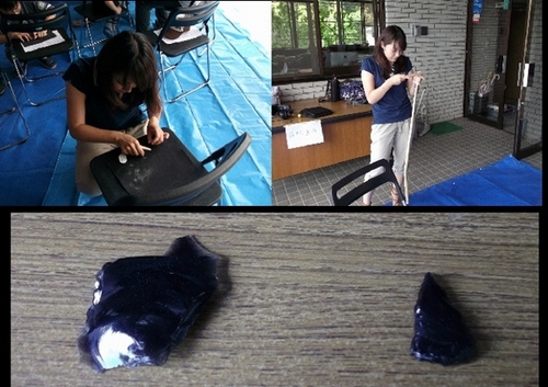 ② 薄い黒曜石の破片の端を削り、矢じりの形にしていく