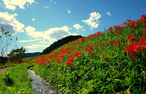 那須町簑沢地区の彼岸花群生地も見事です。東山道沿いのこの場所は、 源義経が通ったといわれ、周辺には様々な義経伝説が残り、 別名義経街道とも呼ばれています。この簑沢地区で、毎年、 真っ赤に咲き誇る彼岸花が群生しています。 見頃は、例年ですと9月20日前後。那須ののんびりした 田園風景の中咲き誇る彼岸花は、これぞ日本の風景という 感じでお勧めです。ぜひご覧ください! |