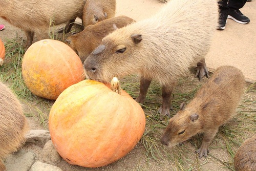 毎年恒例、カピバラたちにかぼちゃをプレゼント!