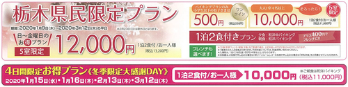 ・1月15日、16日(水木)、2月13日(木)3月12日(木)の4日間限定で… 【栃木県民感謝DAY】 1泊2食付きが…大人10,000円(税別)お子様500円(税別) 1諭吉1コイン+消費税でご用意いたします! 新年会、バレンタインデー、ホワイトデーそして卒業旅行と 冬の那須を思いっきり楽しんでください!! 栃木県民でよかったー!! |