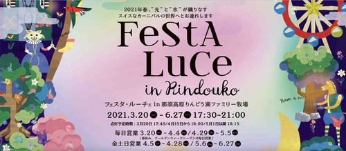 「フェスタ・ルーチェin那須高原りんどう湖ファミリー牧場」が開催中! りんどう湖を中心に、小さなスイスをイメージした建物、湖、森林などの 景観を活かし、「“光”と“水”のスイスなフェスティバル」をテーマに、 「春のスイスのカーニバル」をイルミネーションと光と映像で再現しています! 「湖に投影する壮大なプロジェクションマッピング」や 「子どもたちが楽しめる光の遊園地ゾーン」 「湖を横断出来る光のジップライン」など、 イルミネーションと光と映像が織りなす 「イマーシブ(没入型)フェスティバル」を体感できますよ。 もちろん、既存アトラクションもフェスタ・ルーチェ仕様となって 昼間とはまた違った「夜」の那須高原りんどう湖ファミリー牧場を お楽しみください! 期間限定の「春の夜桜ピンクのライトアップ」 「桜のカーペット プロジェクションマッピング」も実施中。 Instagramのフォトコンテスト、 フェスタルーチェオリジナルマスクのプレゼント お子様向けのマジックグラス無料プレゼントもあります。 「フェスタ・ルーチェ」について詳しくは、 那須高原りんどう湖ファミリー牧場のHPをご覧ください! ![]() |