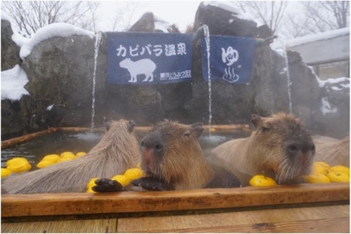 明日18日(土)~21日(火)の4日間 冬至のイベントとして カピバラのユズ湯を開催。 時間は、11:00~で カピバラの森の中にあるカピバラ専用露天風呂にゆずを入れます。 今年は、ユズの名産でもある茂木産のユズをたっぷりと入れる予定。 冬至には、「ん」が付くものを食べると運が呼び込めると言われていますので、 この冬を元気に乗り切ってもらって運を呼び込もうと、りんごとかぼちゃを入れます。 幸せそうなカピバラの様子をご覧くださいね! ![]() |