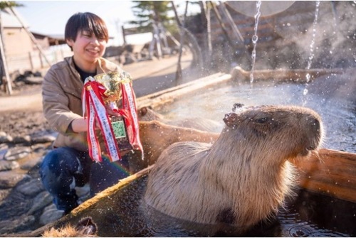 5つの動物園で同日開催し、各園国を代表する出場選手であるカピバラがお風呂に入る 時間の長さを競う大会なのです。伊豆シャボテン動物公園を代表して「ゆげ」、 長崎バイオパークでは「ドーナツ」、埼玉県こども動物自然公園では「イリサ」、 那須どうぶつ王国では「コハル」、いしかわ動物園では「モミジ」が代表カピバラに 選出されました。 那須どうぶつ王国は、昨年「コブ」くんが出場し3位という少し 微妙な結果で終わってしまいましたが、 マイペースな「コハル」ちゃんが3時間40分29秒というタイムで圧勝! 優勝トロフィーが、那須どうぶつ王国に帰ってきました!!! ![]() コハルちゃんは全然気にする素振りもありませんが(笑)
