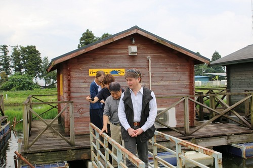 ウッディな造りでエアコンも完備、さらには ここでBBQもできちゃうという快適さ。 この「遊び心」には参りました! そう思い、この家から出ようとしたその時、 関根さんの究極な「遊び心」を発見してしまった。 ログハウスの床に、直径10センチほどの穴が開いている。 まさか!? 「そのまさかです!」そう言わんばかりの笑顔で、 関根さんが語りだす。 「ワカサギ釣りみたいに釣りができます。」 淡々と説明するが、今は冬でもなければ 雪も氷も見当たらない! なんとこの直径10センチほどの穴に糸をたらし、 釣りができるのだ。 ![]() 池に浮いているが故にこれができちゃう。