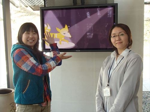 芦野石や和紙が使われていて、モダンの中にも温もりを感じる空間が広がります。 お洒落な装いのその理由は、世界で活躍されている建築家・隈研吾が デザインした建物だから!建築の勉強をされている方にも人気のスポットです。 最初のコーナーでは「道」をテーマにした展示が見られます。 那須の歴史を映像とジオラマ(情景模型)でわかりやすく解説されていて、 「へえ~」「なるほど」の連続。 続いては、昔々の品々が展示してあるコーナーがお出迎え。 土器や甲冑、絵巻など、それぞれの時代に使われていた物が並びます。 お客様がいらっしゃったので声をかけてみると、 湯治で芦野温泉に来られていた方で、「那須にも歴史があったのね~」と 感慨深くおしゃっていました。 さて、いよいよアニメコーナーに突入です! ぼうや~良い子だ寝んねしな~♪那須昔ばなし~♪ 那須に伝わる昔話が、なんとこちらでは! アニメーションで楽しむことができるんです!! ![]() 小さい頃、日本昔ばなしをテレビで見ていた私にとっては