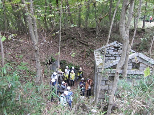 産業遺産って何かっていうと・・・ 日本の産業近代化に貢献した工場や倉庫など その歴史を伝えるものを未来へ残そうという動きの中で作られた文化遺産なのです☆ 銅の算出の際に出た亜硫酸ガスと鉱山廃水の対応の中で培った有害物質の除去技術の開発発は、いまや世界でも利用されています。 鉱害ばかりがイメージされる方も多い中、 近代化の波と、衰退の波を短い期間で潜り抜けてきた 教育的にも大きな歴史的足跡をのこしてくれる当時の建造物があちこちに 残っている足尾は、今後も注目のエリア。 後世に伝えるべき語り部としての、これらの建造物を世界遺産に!という動きも 活発な今日この頃、古河機械が年に2回行っているのが、見学会☆ 募集をかけるとほんの数時間で満員になるほどの注目度だったりします。 最初に説明会をしっかり聞いて、ヘルメットかぶって現場へ・・・ 今回の見学場所は2箇所。 いずれも紅葉の中にひっそりと佇んでいました。 ★通洞選鉱所