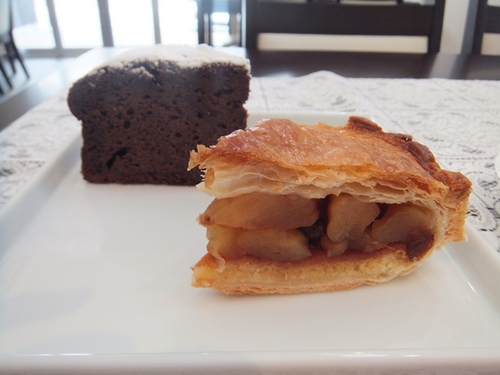 ケーキ2種類とドリンクで600円! ケーキ3種類とドリンクで800円! ね???これ、お得でしょう? ケーキは、ガトーショコラ、アップルパイ、 フルーツパウンドケーキ、タルトの中から選びます。 こばちは、ガトーショコラとアップルパイにしました♡ ![]() ここのケーキは甘すぎないし、