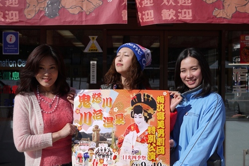 会場はこちら、鬼怒川温泉駅前広場。ここに特設ステージができて、たくさんのゲストが華やかに登場します。1日ごとにテーマがあるんです。