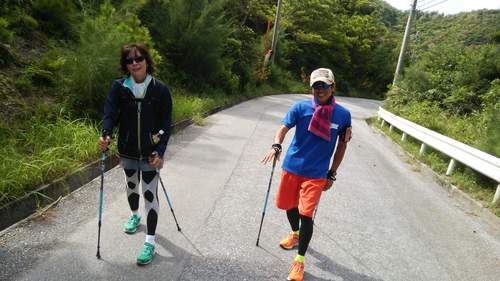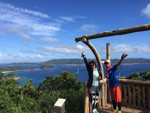 初めにチャレンジしたのは、「海」ではなく「山」!のアクティヴィティ、『ノルディックウォーキング』です。ノルディックウォーキングは、スキーのような2本のストックを使って、山などを歩くフィンランド発祥のウォーキング。初挑戦の私は、ガイドの座間味村観光協会・斉藤慎也さんと一緒に、絶景の「高月山展望台」を目指す3キロのコースにチャレンジしました!
