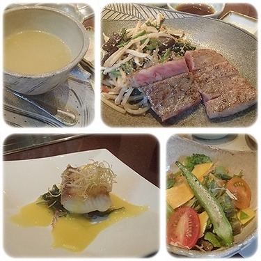 食材もこだわりのものばかり! 地元のお肉屋さんから取り寄せた、A4ランク以上の那須和牛を中心に、 とちぎ和牛のプレミアムブランド「匠」(とちぎ和牛の中でも11%しか認められないブランドです!)など、厳選されたお肉を使用されています♪ 他にも産地直送の魚介類、契約農家からの新鮮な野菜、ワインなどお肉に合うアルコール類など豊富に準備!お肉だけではなく、すべての食材に愛が込められているのです♡ 今日私がいただいたのは、ランチコースの那須和牛サーロイン(¥8100)!!! 今日仕入れてくださったのは特別甘くてとろける上質なお肉だったそうです!! 今日の調理は料理長の山田さんにお願いしました☆ サラダ、スープ、お魚料理が並び、最後にお肉を目の前の鉄板で焼いてくださいました~♪ Ⳇ圼 ![]() (色とりどりの副菜と、素晴らしいお肉!)