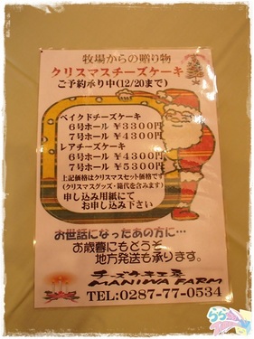「那須の雪解け」も「レアチーズケーキ」も さっぱり&すっきりしていて、ほどよい酸味と甘さ。 甘いものがそれほど得意ではない私もぱくぱく頂いてしまいました(^0^) 「ベイクドチーズケーキ」はその独特のしっとり感と チーズの風味がしっかりでています。こちらも、おいしい!! そして土日数量限定で、この3種類が全部楽しめる 「チーズケーキ三昧」という、 スペシャルなセットもあるそう! これは要チェックですよ~。 マニワファームのケーキは買って帰ることももちろん可能なのですが、 ぜひ店内で食べてみて頂きたい! カフェスペースからは、広々とした牧場と、そこに放された牛たち、 そして那須の山々を臨むことができるんです(^^) のんびりとした場所でのんびりと景色を眺めながら頂くチーズケーキは クリスマス前にちょっと早い自分へのプレゼントにもなっちゃいますよ(^3^)♪ (オーナーの摩庭正さん) ![]() ★・・・・・・・・★・・・・・・・・★ チーズケーキ工房MANIWAファーム 栃木県那須郡那須町大字豊原丙4525 0287-77-0534 営業時間:平日 11:00~17:00 土日祝10:00~17:00 木曜定休 ★・・・・・・・・★・・・・・・・・★ そして朗報! MANIWAファームのクリスマスチーズケーキが 明日12月20日まで予約出来ちゃいます! この機会に是非!と言う方はお急ぎください~! ![]() |