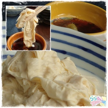 でも稲葉商店ではこの一枚を350円で提供しているんです。 手間はかかるけど、おいしいものを少しでも安く、というお店の心遣いがうれしいです。 そしてできたての湯葉、今回はわさび&ポン酢でいただきました! もう「やめられない止まらない、ゆば♪」って感じです(●´▽`●) ![]() とろ~っととろけていそうで、口に入れるとしっかり歯応え&大豆の味が!