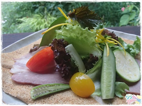 約150年の歴史を持つ古民家ということもあって雰囲気がすごい! 吹き抜けの高い天井、囲炉裏、そしてこげ茶色の太くて立派な梁。 そしてこの歴史ある古民家に野島さんご夫婦のアイディアを加え、 天井に窓を設けて明るくし、 イスとテーブル席だけでなく3畳ほどの小上がり席が設けられました。 建物の周りは林でとても緑が深く、小川の流れる音が聞こえます。 ![]() こんな場所も建物も最高の環境で楽しめるカフェ! メニューも気になりますよね(^0^) 夢屋のイチオシは「ガレット」です。 そば粉を使ってクレープのような生地を焼き、 そこに果物などを乗せればデザートに、 野菜やハムなどを乗せればお食事になるんです! 私は野島さんの旦那さんが手作りしたという 自家製ハムと地元の野菜がたっぷりのったガレットを頂きました。 ![]() そば粉独特の香ばしさと野菜のシャキシャキ感、