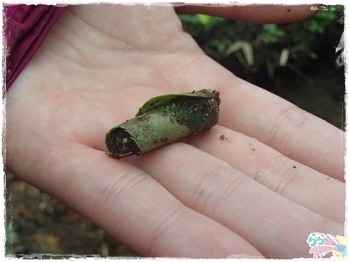 晴れている日には見られない動物の足跡なども見ることができたりするそうです。 この日私たちは“巻物”と呼ばれる謎の物体を探して森を歩きました! 巻物とは何ぞや? それは「オトシブミ」という虫が卵を産みつけ、巻物のようになっている 葉っぱでした。巻物を探し森を散策すると、木々は雨に濡れ、 一層青々としてキレイでした。濃い緑の匂いも感じられます。 ![]() インタープリターの中島さんのガイドによってなんとか見つけることのできたオトシブミの巻物。