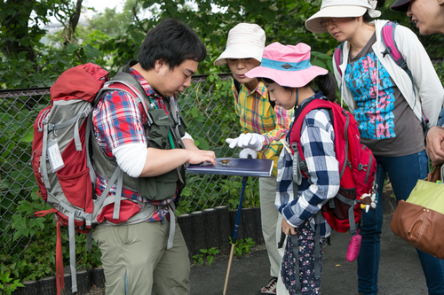 6時半くらいにビジターセンターを出発。 森の中を散策、草花や木々、鳥や虫についてインタープリターのガイドを聞きながら、楽しく歩くことができ、ゴールの温泉朝市会場を目指すというものです。 ![]() 今回は、昆虫が大好きというインタープリター長田さんのガイドで約1時間半。
