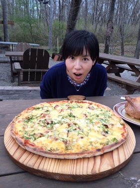 屋外でおいしい手作り料理が楽しめる「キャンプキッチン」。 もう私たち、ららなす取材チームもすっかりお気に入りになりました! 「帰りたくなーい」って、私思わず言ってしまいましたよ(笑) それくらい、とても贅沢な空間、そして萩庭さんご夫婦の提供してくれる 料理がおいしいんです! ![]() まずとにかくピザが大きい!!!