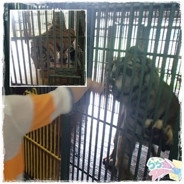 ベンガルトラのケンタくんが待ち構える檻まで待つこと約20分。 私たちは最後尾で、お客さん達がどうやってエサをあげているか様子を見ていると・・・ 「ガーフっ!!」(ケンタくん) 「いやーーーー、こわいーーー」(小さい女の子) 「・・・・・・」(あやの) ケンタくん、結構顏がでかい。 脚太い。 こ、こわい。 順番が進むにつれ、緊張が増してきます。 いざ、私の番が回ってくると、ケンタが間近に。 一応「トングを使って」エサをあげることに、少しホッとしましたが。 できるだけトングのさきっぽを持って、ケンタくんにお肉を差し出すと、 なぜか檻の端から勢いをつけて大きな口を開けて走ってきた・・・!!! 「あ゜ーーーーー!」(あやの) ![]() 「がぶっ!!ぺろりん。」(ケンタくん)