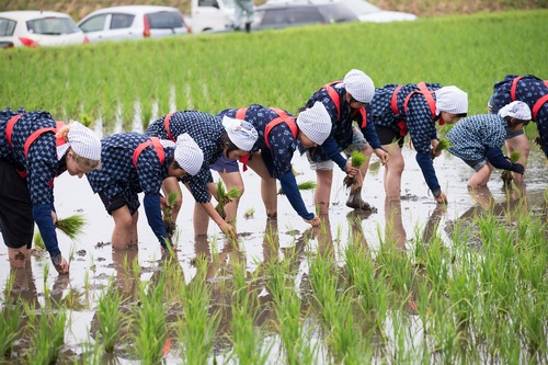 毎年開催されているこの田植えまつりでは、 昔ながらの農耕馬によるしろかきや 芦野の女性たちの間で代々伝わる「田植え歌」を見ることができます。 ![]() 当日田植えをする女性たちは、紺のかすりに茜だすき姿。