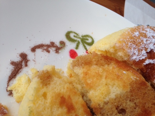 なぜ、こんなに極厚なんでしょう?美波さんに伺ったところ、時間をかけて混ぜているから、しっかり膨らむのだそう。材料は、小麦粉・卵・砂糖とシンプル!混ぜ方・分量など徹底したこだわりがあります。開発まで何度も何度も試作されたそうです。まさに奇跡のパンケーキ! この「極厚スフレパンケーキ」は、注文を受けてから作られるため、席に届くまで20〜30分かかります。 でも!!待つ価値有り有りです!!! シンプルだから感じられる卵の優しい甘み、極上のフワフワ感、柔らかい生地にメープルシロップがよく染み渡り、とってもジューシー!!他では味わえないミラクルなパンケーキです☆ パンケーキの美味しさに夢見心地で。。食べている途中で気付いたのですが、お皿のふちに可愛らしいサクランボの模様が♡ ![]() 食べられるパウダーやジュレ状のもので描かれていました。さりげないKawaiiにトキメキMAXです!!