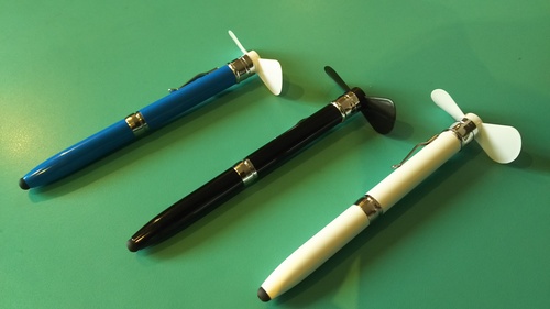 さらに効率アップしていただきたい! 新しい文具をご紹介したい!ということで、 最新文房具の中でもさらに絞りこんで…ハイスペックな「ペン」を ご紹介しました! まずは…書くだけのペンとはもうさよなら・・・ ★学研「エコー・スマートペン」 (2GB 24000円(税抜)4GB29000円(税抜)8GB 34000円 (税抜)) 株式会社 学研プラスが販売しているハイテクペン。 紙にペンで手書きしながら、同時に録音も可能で、 さらにデジタルデータ化まで自動でできるスグレモノ。 専用ノートの下のほうあるボタンの絵を、 ペン先でタップするだけで簡単に記録を開始できるそうです。 さらに書いた文字にペン先をタップするだけで、 その文字を書いたときに収録した音声を頭出しして再生可能! 全国の家電量販店、大手ネットショッピングで購入可能です。 続いてもほんとにあるの?という夢のペン ★「Scribble(スクリブル)」参考価格 55,290円(税込) クラウドファウンディンサイト キックスターにて販売中のハイテクペン。 ペンの後ろに付いているセンサーでスキャンするだけで、 色を記録し瞬時にペン内部でインクを混ぜ合わせ、 スキャンした場所と同じ色で描く事ができるという夢のようなペンです。 壁、果物、本や雑誌、絵画やおもちゃ、なんでもスキャンできます。 スキャン時間も、インクが出てくるまでの時間も一瞬で、 待ち時間はほとんど無いとの事! しかも一度スキャンした色はBluetooth経由で、 スマートフォンなどのデバイスに保存可能。 タブレットなどと連携すれば、色データの記録や編集ができます。 USBで充電でき、最大7時間稼働。 再現できるカラーは16,000色にも及ぶそうですよ。 ラストは… ★「3WAY(スリーウェイ) 扇風機付きタッチペン&(アンド)ボールペン」500円(税抜) ![]() 前の2品にくらべると、グッとリーズナブル!