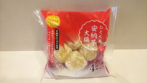 紫芋風ペースト入り生地で巻いたロールケーキ。 焼芋の断面に見立てた見た目もポイントとのこと。 続いてはこちら・・・ ★「ファミリーマート ひとくち安納芋大福」(税込 138円) ![]() 甘味の強い安納芋ペーストをあんに包んだ、
