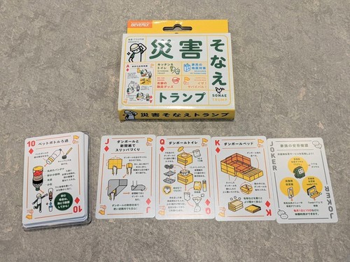 株式会社ビバリーの開発したトランプ。 通常のトランプに震災という 非常時向けのトピックが載っていて、 防災のミニマニュアルにもなっている トランプなんです。 遠方の家族との連絡の取り方、 段ボールでベッドやトイレを作る方法、 ハンカチやビニール袋の活用術などなど、 いざという時に役立つ情報がコンパクトに まとめられています。 この「災害そなえトランプ」は、 実際に被災するまで備蓄品の中に放置しておくのでなく、 普段トランプとして遊ぶついでに覚えたり、 鞄に忍ばせておいて 移動中に単語カードのようにみたりしながら、 知識を深めるのにも役立ちます。 今日ご紹介した、「災害そなえトランプ」は、 全国の量販店のおもちゃ売り場や、 大手ネット通販で購入可能です。 今日のトレナビは… 「普段から使える防災グッズ」をフィーチャーしました。 |