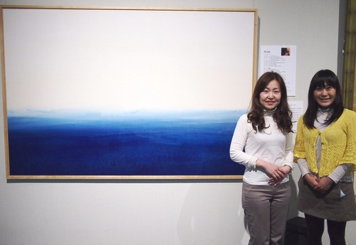 まぶしいくらいに きらびやかな作品。 同じ牡丹の花でも 最初にみた松尾敏男さんの牡丹とはまた違った雰囲気の牡丹です。 「那波多目さんという方は非常に現代的な考えを持っている方なので 西洋の絵から描き方をどんどん自分の中で取り入れていますから とても描写が写実的というか 写真にも似た 本物そっくりに描いています。」 と 大木さん。 ほんとに もしかしてこれ押し花?!と思わんばかりに まるで本物の牡丹のよう。 「多くの日本画家の方はこういった展覧会に出した時に もうそれで完結するんですね。 でも那波多目さんは 展覧会に出して自分で作品をみて 何か足りないな。と思ったら どんどん書き足していくんです。 お手持ちのリーフレットを見てみてください。」 と言われ見てみると・・・ あれ?何かが足りない!! ひらひらと飛んでいる2匹の蝶が リーフレットに掲載されている作品には描かれていないんです!!! しかも本物そっくりの蝶で まるで本物の蝶が作品の牡丹のまわりでひらひらと舞っているかのよう。 どこかの展覧会が終わった後に書き加えられた2匹の蝶だったんでしょう。 「那波多目さんは 作品をだんだん進化させる。という考えをお持ちなんです。」 次にあなたがこの絵に出会うときは また どこか進化しているかも?! 50点以上もある作品たち。かなり見応えがあります。 最後に観た作品は 思わず 「うわーぁ すてきな一枚。」 とうっとりため息がでちゃうような作品。 ブルーのグラデーションがどんどん上にいくにつれ薄くなっていき 上の方はほとんど白い大きな一枚の絵。 「これは 海ですか?」 と 聞くと 一瞬間をおいてから 「そうですね。何に見えるでしょうか。」 と ちょっと戸惑い気味の大木さん。 え?!海じゃないんですか!?海かなと思ったんですけど・・・とうろたえる私。 「これを描いた作家は荒井経さんという方なんですが 「作品を見て 作品を見ないで欲しい。」 とおっしゃるんですね。 というのは 「作品を見て 自分でこの中で旅をして欲しい。」 とおっしゃるんですよ。 ですから これを見て海と感じたら海でもいいんです。 ・・・ちょっともう少し近づいて見てみてください。」 と大木さんに言われ 近づいてみると・・・ 海じゃない!!!この絵は・・・ 海じゃない!!!!! 悲鳴のような驚きの声をあげる私。←美術館なのに。 これは・・・山里?! 川があって人々が暮らしているような風景が見えてくるではありませんか。 ![]() 「海とおっしゃった方は初めてかもしれません。」