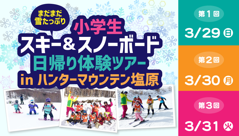 | 対象 | 初めてスキー・スノーボードを経験する、小学1年生~6年生 ※卒業年次の6年生可、入学前の1年生不可。 ※お子様のみ対象の体験ツアーです。バスガイド・現地ではインストラクターがお世話します。 ※保護者の参加は出来ません。 |