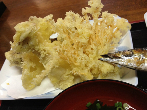 今回僕がおじゃましたのは、 高根沢町の台新田地区亀梨にある 居酒屋「いい村亭」です! 居酒屋と言っても、一応お食事処。 ランチもやっているんですよ! ということで、今回はこちらのお店で 秋の味覚を堪能してきました! お店の店長である飯村一章さんが、 美味しい料理を用意して迎えてくれました。 ![]() 今回僕が頂いたメニューは、こちら! ![]() 『秋の味覚定食』850円です! 長さ30cmほどの大きな焼さんまと、 5種類のきのこの天ぷらが迫力満点! ![]() さんまは脂が乗っていて口の中が