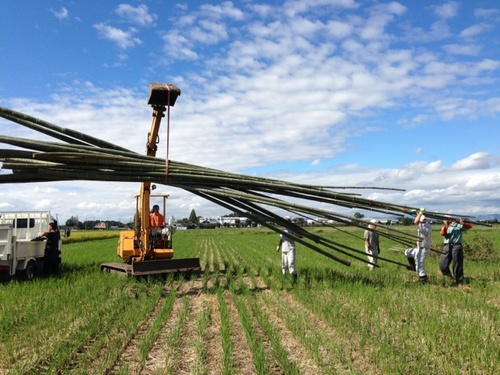 祭りの最後には火がつけられ、夜空に向かって高く燃え上がる姿は圧巻です。 そんな祭りの目玉であるモニュメントを実行委員の方々が 今年も制作するということで密着しました。 朝8時半に集合し、みんなで竹を伐りに行くところから始まりました。 ![]() 私もなたを使って余分な枝葉を切る作業を手伝いました。 …が、綺麗に手早く切るのは難しく、あまり役に立ちませんでした; すいません……。 それから、竹を会場となる田んぼに運び、 組み立て作業が始まりました。 ![]() 自分たちの身長の3,4倍もある竹を組み立てるのは大変そうです。
