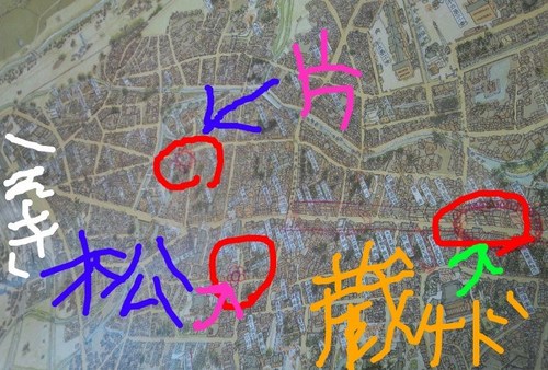 ★さいごに片岡さん、ずっと栃木市を見てきて感じている栃木市の魅力を教えてください。 「根源を成すものは、母なる巴波川、父なる太平山。その二つに囲まれた栃木市は、それを中心に河川問屋が開かれ、多くの蔵が作られ、いくらかでも現在の私たちは潤っている。それをもとに、甘んじることなく、みなさんといろいろよりよい栃木市を作っていけたらうれしいと思います。」 ありがとうございます。 サイトウも、栃木市のPRがんばってまいります!!! 「栃木市鳥瞰図」から。 大変おおざっぱではありますが… 左側に「栃木駅」、「片」は片岡写真館さん、「松」は松屋さん(和菓子)、「蔵」は、大通りで蔵を見ながらインタビューさせていただいたところです。 ![]() ***********************