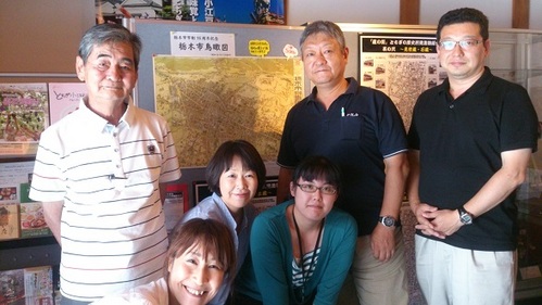 ★「うずま???」すごく気になるネーミングのお菓子ですね、どんなお菓子ですか? スズキさん「釜で焼いている焼き菓子で、巴波川(うずまがわ)からの"うずま”で、中は全体が“黄味あん”でできているんですね。ぽっくりとしていて、熱いお茶といただくとスーッととけていって、とってもおいしいですよ(*^^*)」 片岡さん:うずま サイトウ:きんつば にしてみました。 ※「きんつばは、お寿司屋さんで言う"たまごやき”にあたる」とすずきさんに教わったからです。和菓子屋さんの命、あずき。このおいしさがわかるのが小豆でできたきんつばだからだそうです。(^^)ナルホド!! うずま→黄味あんがぽっくりとしていて、上品な甘さでおいしかったです♪ きんつば→皮が薄く、中の小豆がしっとり柔らかくほどけ、夢中で食べちゃいました♪♪ 思い出すだけでも、にんまりしてきちゃいます!!! 栃木は巴波川の河川問屋の人たちのお客さん接待用とされ、好んでお菓子を食べたので、和菓子が発展したものと思われるそうです。 ![]() 楽しかった、「栃木市鳥瞰図」をもとにした、まちめぐり。