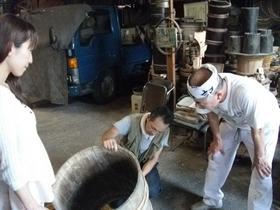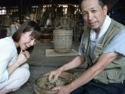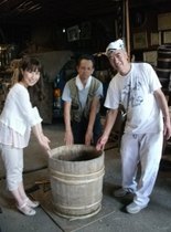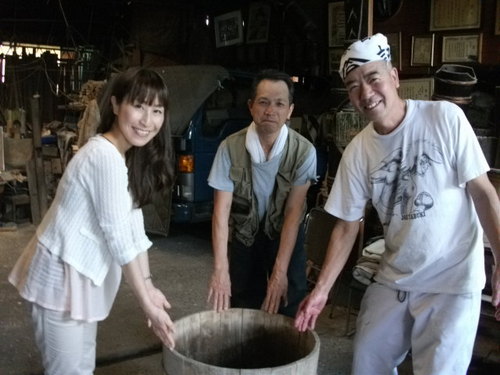 こちらは、取材中たまたま“修理”に訪れた、栃木市の有名なお蕎麦やさん「いづるや」さんが持ってきたものです。 (というわけで取材の内容はここで急変しました←ウラ話です 笑) いづるやさん、以前「たくあん」をつけていたけど底が抜けてしまったものを修理し、「どじょうをいれたい」とのことでした。状態を一瞬で判断し、萩原さんは作業に取り掛かかりました。 そうです。萩原さんは、樽を一から作ることはもちろん、修理もなさるんです。 記念に1枚☆ (右から、いづるやの大塚さん、萩原さん、サイトウです♪) ![]() そんな萩原さんに樽について伺い、印象的だったことは…