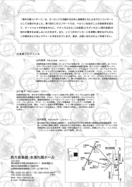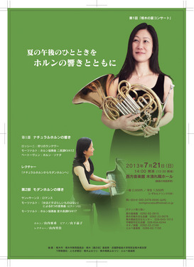 ~ヨーロッパで活躍する、ホルン奏者の山内亜希さんと、ピアニストの山下晶子さんを迎えます。モーツァルトのホルン協奏曲やベートーベンのホルンソナタなど、ホルンの響きを思う存分堪能できる楽曲の数々をお楽しみいただけますよ。~ ☆コンサートの魅力☆ 味わって頂きたいのは・・・ズバリ!「ホルン」の音色です! 今回は、モーツァルトの時代に使われていた古楽器のホルン「ナチュラルホルン」と、 現代で使われているホルン「モダンホルン」、2種類のホルンで演奏されます。 古楽器の「ナチュラルホルン」と現代の「モダンホルン」では、それぞれ楽器のつくりも音色も全然違いますし、古楽器の「ナチュラルホルン」の音色を聴くことができる機会はなかなかありませんので、ぜひこの機会に、ご自身の耳で2つのホルンの音色の違いを感じてみてはいかがでしょうか。 ------------------------------- 栃木の夏コンサート ●日にち:7月21日(日)午後1時30分開場、2時開演 ●場 所:西方町の、西方音楽館 木洩れ陽ホール ●料 金:一般2000円、学生1500円(いずれもドリンク付き) チケットは現在発売中です! ●問い合わせ:電話 0282-92-2815(西方音楽館) ------------------------------- ●コンサートパンフレット↓(表・裏) ![]() ![]() ☆「木漏れ日ホール」について☆