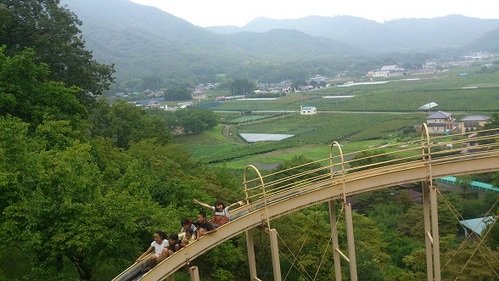 夏休みにお子さんたちと一緒に思いっきり楽しめるとっても長~いすべり台=ローラースライダーをご紹介しました!!! ☆このスライダーなんと長さが144mあって、県内で一番長~いのだそうです。 らせん状にぐる~っとまわりながらおりていく形で、景色も素晴らしくきれいなんですよ! すぎたさん、わたなべさんのご兄弟(小1、2、4、5、6年生)5人の大平町のお友達とサイトウとディレクターと一緒に滑りましたよ! ![]() スタート地点は、小高い丘。
