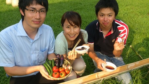 そうめんはもちろんのこと!! おいし~い夏野菜も次々と流れてくるではありませんか☆ JA下野管内で人気のお野菜が次々と竹の水を伝って下りてきました☆ 【ご注目~】----------------------------- ●ひめきゅうり…14~15㎝ほどの小さなきゅうり。皮が薄く甘みがあり、生で食べたり浅漬けにしたりします。とても食べやすくて、口当たりがよくて、次々いただいちゃいました。 ※ひめきゅうりは珍しく、栃木県内では栃木市のみの生産なのだそうです! ●みょうが…新鮮な辛みがそうめんの薬味としてもぴったり! ●ミニトマト…いろいろな種類が販売されていましたが、今回はミニトマトの1.5倍ほどのフルーツトマトを流しました。甘くてボリュームがあるので、うれしい♬ どれも夏らしく、味がしっかり感じられて、とってもおいしかったです。 そして栃木市のお野菜は、“みずみずしさ”が違う☆ ように思うんです。 こうして丁寧に作られて、新鮮なものを食せるのは幸せですねー。あと、 ●なす 実は生ナスも流れてきたので、持ち帰って「おつけもの」にしましたよ。 後で、ブログで紹介させていただきたいと思います。 ----------------------------------- (感想)栃木市内で竹をいただき、その竹を伝う水に流れるそうめんばかりか、市内の新鮮な野菜を食べて、栃木トークもして・・・・栃木市の恵み、やさしさに包まれた思いでした。 今でも思い出すとワクワク感がよみがえります♪ 栃木市に来ると、栃木市の自然、お野菜のおいしさ、そして人のやさしさを感じられます。 おいしーいお野菜も「WELCOME♬」 ![]() |