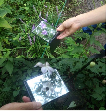 約1600坪あり、山・郷・林・湿地…4つのゾーンがある園内。 1時間ほどで、ぐるりと散策することができます。 山のゾーンで「レンゲショウマ」という花を発見! 下向きに咲いているので、指で上向きにして見てみよう…と思ったところ 「咲いているまま、鏡で見るときれいですよ」と増渕さん。 鏡にかざすと花びらが日光に透けてすごくきれい!!! 咲いている姿のまま、見ることもでき、大発見でした★ (いままで手鏡をこのように使ったことはありませんでした!) ![]() そして、今が見ごろのお花は…