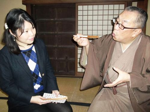 手ぬぐいは、名前の柳橋から取って「柳」が描かれています。 この落語家さんにとって重要なものを使って いざ、挑戦!! 扇子で一番使われるのは、そばをすする動作 思い切りそばをすすり最後には、鼻をすする。 柳橋さんは、とっても簡単そうに あたかもそばを食べているかのように おいしそうにすすっていらっしゃいましたが・・・ ![]() もちろん、経験のない私、