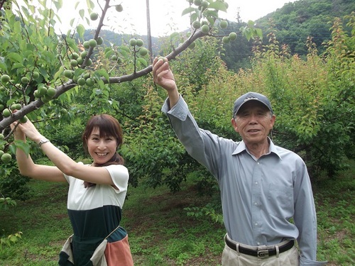 「あまり手がかからないものでよいものをつくろう」とみんなで考え、梅園ができた、ということです。「みんなで考えて」、というところが素敵です。 現在は、海外から研修にくるほどの出来で、年々生産量も増えているんだとか♪ 収獲の仕方を教わりながらひとつひとつとっています。 梅の実は、ちょっとひっぱるとすぐにとれます。 「一生懸命なった梅だから、はやく楽にしてあげよう」と採取を進める中野さん。 私がとった梅、「やれやれ」と楽になってくれたのでしょうか♡ そして真上の梅の特徴…真上地区の自然と豊富な水から育まれたからか、「「実が厚い!」」と感じました。”ぼってりぽってり”している感じです。いただいた梅干しの「ジューシーさ」に驚いたのです。 ![]() 放送ではお伝えしきれなかったのですが、生産している種類はなんと、4種類!!!