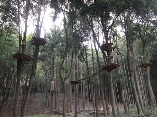 木と木の間にかけられた、縄でできた梯子を上ったりと、