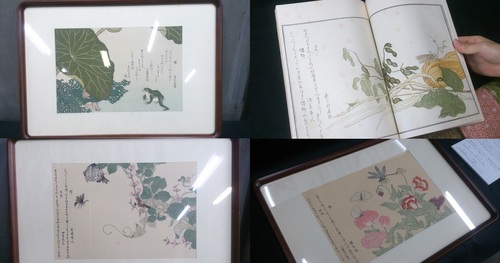↑背景に見えるのが、歌麿が描いた狂歌「絵本」(『画本虫えらみ』『百千鳥』)の絵です。