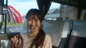 A「バスはふつう長方形の形をしていて、後ろにエンジンがのっているけれども、ボンネットバスは、車体の前の部分=ボンネットの部分にエンジンがのっている」のだそうです。大きさは13人乗りとコンパクト。お客さん同士の距離感もぬくもりを感じそうな空間使いです。 ![]() 今回の運転手さんは、増山悦子(ましやまえつこ)さん!