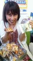 手には和菓子を持ち、膝の上にはおかきの缶を乗せ・・・