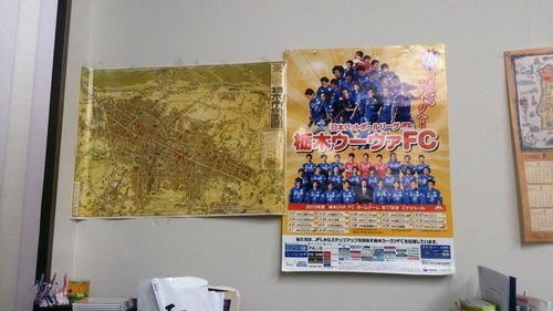 いつも見ている風景。![]() ひとつは「栃木市鳥瞰図」の復刻版。 今からおよそ60年以上前の栃木市の街並みを描いた地図です。 「鳥瞰図」は、読んで字のごとく、 ちょうど鳥が空の上から下を見たとき目に映った様子を 絵にしたものです。 地図といっても、普通の地図に使われるような記号はなく、 鳥瞰図では、建物などそのままそっくり絵で描いています。 色もレトロで、 情緒あふれる蔵の街の雰囲気にぴったりですよね。 この地図を片手に街歩きをしたら、 蔵の街の今と昔を見比べることができちゃいますよ♪ そしてもう一枚は、栃木ウーヴァFC。 選手のみなさんの顔写真が載っているのですが、 さーやを挟んでちょうど真横に貼ってあるので、 なんとなくいつも右から見られているような気がします。 仕事中、ふと右を見ると、選手のみなさんと目が合います。 凛々しい顔でビシッと座っているみなさんの姿を見ると、 私もシャキッとしなくては!と思います。 |