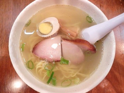 じつは、全て出汁に使っているのだそうで、なんとラーメン1杯に 約3匹もの鮎のエキスをギュギュっと詰め込んでいるのだとか。 川魚の臭みをとりつつ、甘いスイカのような鼻に抜ける あの鮎独特の香りをスープで再現するために、費やした年月は 11年! 琥珀色の透き通ったスープの上には、鮎から出たきれいな脂が 浮かんでいます。 具材はシンプルに、ゆで卵・メンマ・焼き豚・ねぎ。(↓ 塩味) ![]() 栃木県内の鮎を使い、落合さんご自信が、鮎を開き、
