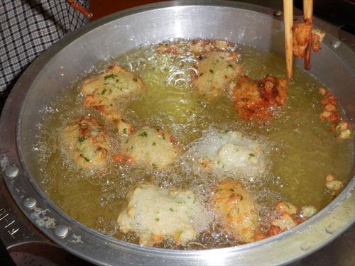 ある程度ざるなどで、水分を切ってくださいね。 全てを混ぜ合わせたら、タネの完成です。 180度の油でじっくり揚げていきます。 どの材料も、夏にとれるものばかり。たったこれだけの 材料で、驚くべきおいしさになるんです。 お料理を教えて下さった主婦の皆さんが子供の時から 食べてたということで、明治時代くらいからあったのでは・・・ というお話でした。 ![]() 周りがこんがりきつね色に揚がったら、完成です。